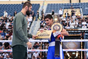وشارك البطل الإماراتي حمزة شيماييف، المتوج بلقب العالم للوزن المتوسط “UFC”، رفقة عدد من أساطير الملاكمة وأبرزهم ارتور بترييف، في تتويج الفائزين بالميداليات الذهبية خلال النزالات النهائية.